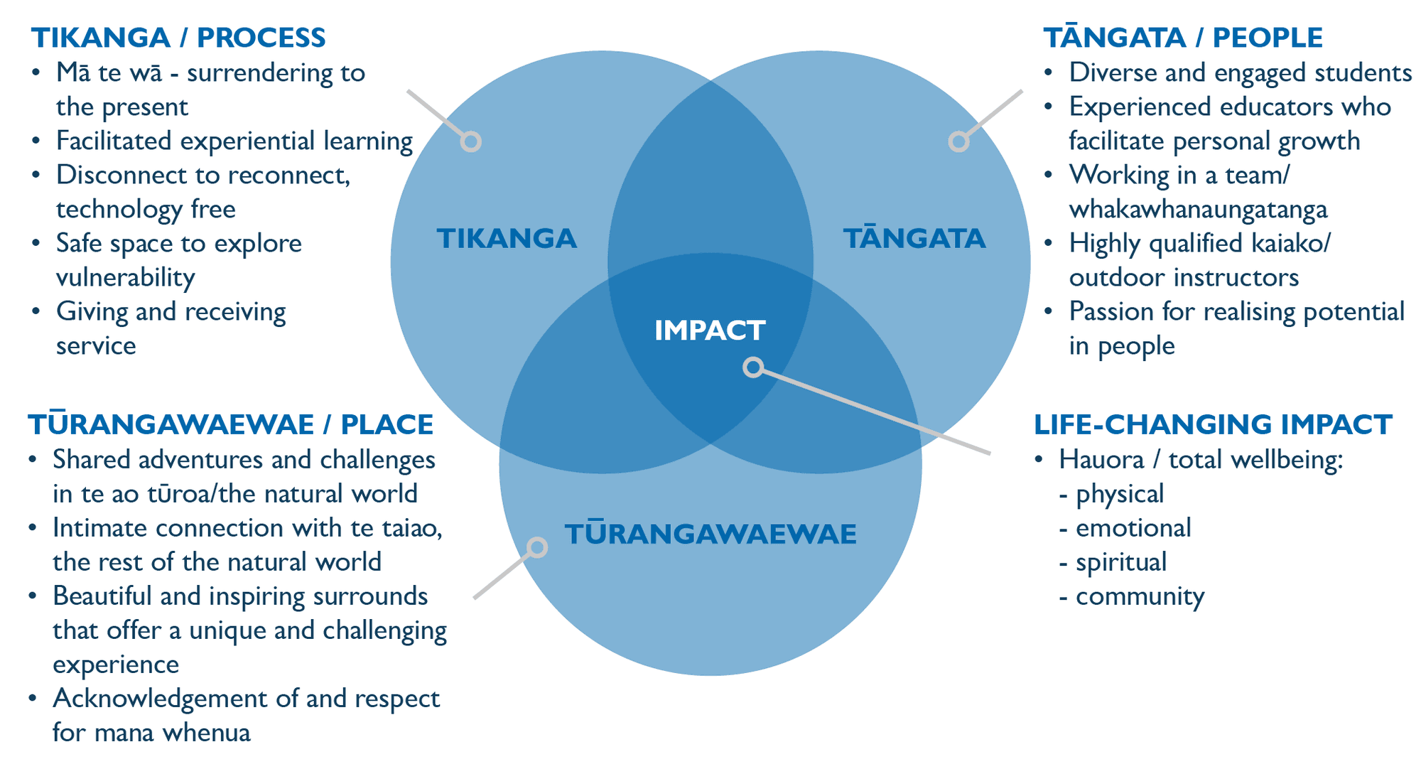 That consistent endorsement reflects the unique and timeless offering that Outward Bound delivers: a magic recipe of ingredients to deliver life-changing experiences for young and old. This recipe for personal development is best illustrated by showing the interdependent relationship of Tāngata, Tikanga and Tūrangawaewae.