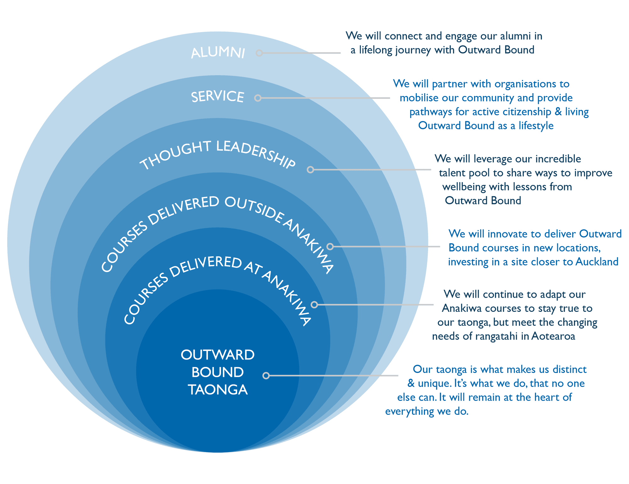 Our overarching aspiration: We have a unique role in building a sustainable future for Aotearoa. By 2030, we will change the lives of twice as many rangatahi New Zealanders with an Outward Bound course, becoming the leading personal development provider for youth as they enter a changing and uncertain world.